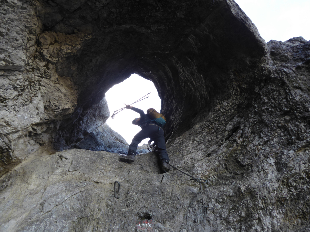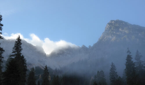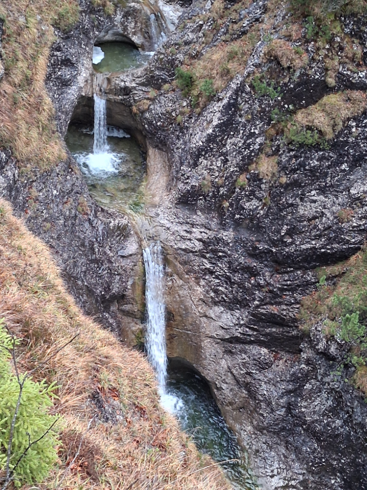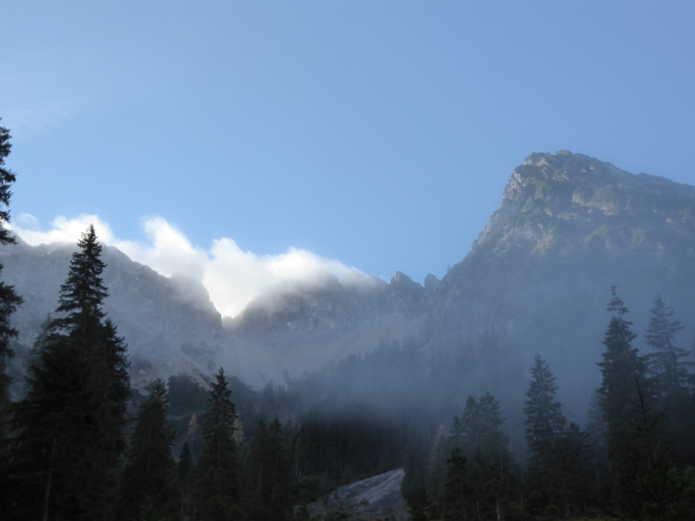 Am Tag drauf gingen wir der roten Valepp entlang zur weißen Valepp und dann rauf zum Schinderkar. Dieses wird steiler und steiler und endet dann in einer steilen Wand. Ein höhlenartiger Durchschlupf vermittelt den Zustieg zur Schinderscharte, welche den bayerischen Schinder vom österreichischen Schinder trennt. Hier war das herbstliche Wetter, sonnig, strahlend blau und mit toller Fernsicht. Wir trafen nur eine Tölzer Dame und bestiegen beide Schinder und dann an der Trausnitzalm vorbei ging es wieder zum Blecksteinhaus um den restlichen Mohnkuchen zu verspeisen. Die Sichtweisen einigten sich auf eine gelungene Rundtour.