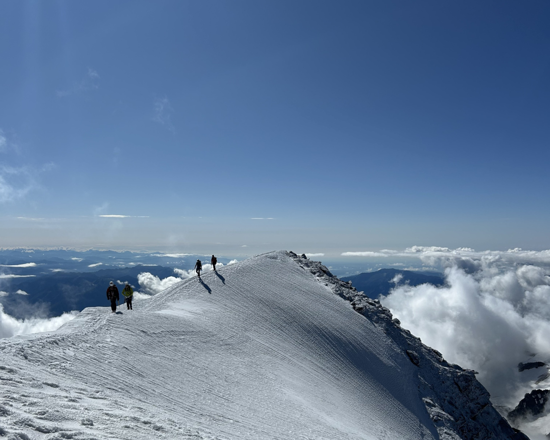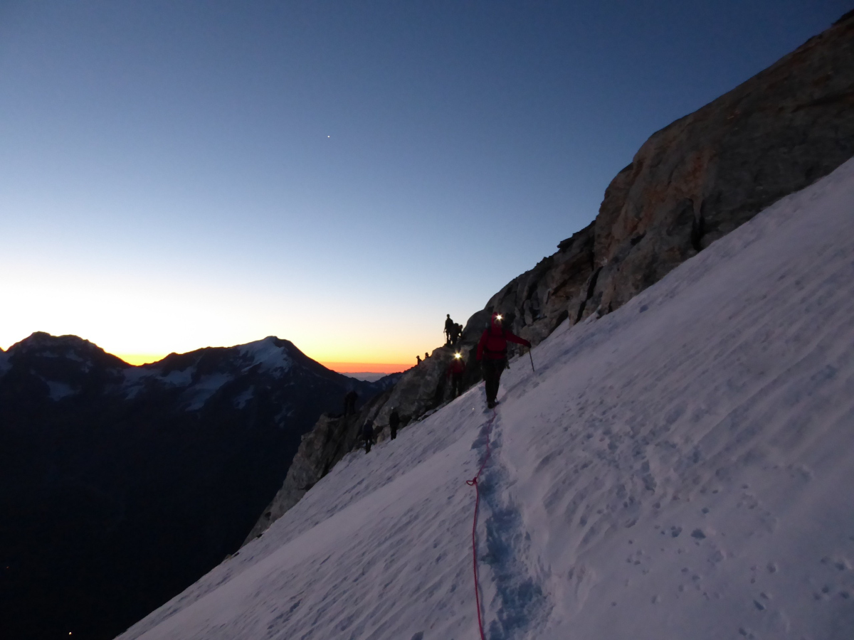 Frühmorgens, Punkt 4 Uhr, starteten wir im Licht unserer Stirnlampen. Beim Aufstieg zum Windjoch begrüßte uns ein strahlender Sonnenaufgang – ein Moment, den niemand so schnell vergessen wird. Eine spanische Seilschaft überholte uns am flachen Gletscher – nur um später festzustellen, dass sie im Steilgelände gegen die niederbayerische Effizienz keine Chance hatte. Am Grat angekommen,