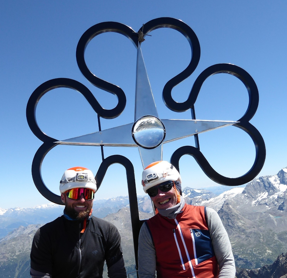 Der letzte große Tourentag begann wieder vor Sonnenaufgang. Der Rückweg führte erneut über den Gletscher und das Ulrichshorn. Dort teilte sich die erste Seilschaft: Zwei Teilnehmer stiegen direkt zur Mischabelhütte ab, während die anderen beiden die zweite Seilschaft einholen wollten, die bereits über das Windjoch auf dem Normalweg zum Nadelhorn (4327 m) unterwegs war. Nach kurzem, aber kräftigem Zwischenspurt gelang das Wiedervereinen – pünktlich zum gemeinsamen Gipfelfoto mit grandioser Aussicht vom Mont Blanc bis zum Watzmann 😉, oder war es doch das Horu?. Anschließend stiegen wir gemeinsam über den Normalweg zur Mischabelhütte ab – erschöpft, aber glücklich.