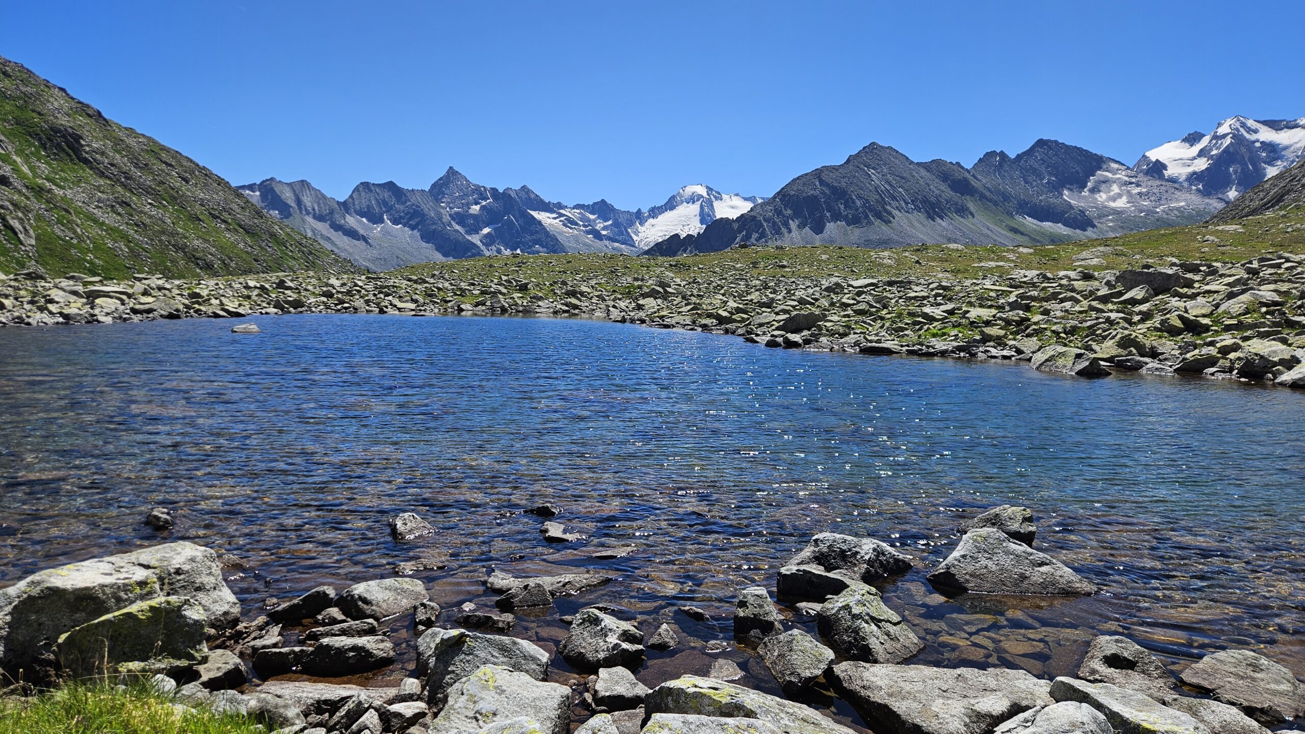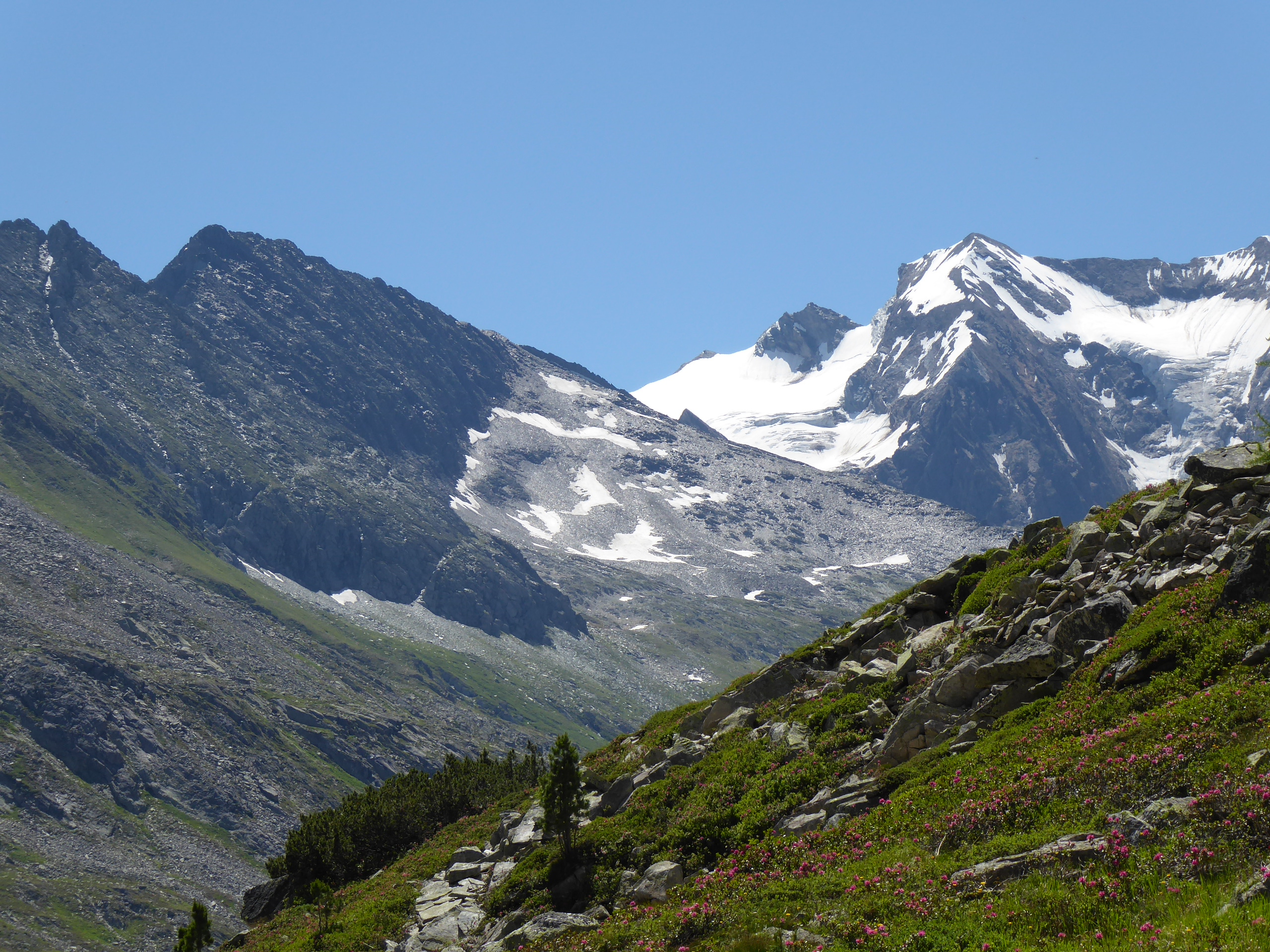 Am Sonntag stiegen wir noch zum Molybdänbergwerk und dann zur Alpeiner Scharte auf. Was für eine tolle Aussicht auf den Schwarzenstein, den großen Möseler, Breitnock, Weißzint, Hochfeiler und Hochferner! Weiter runter ging es dann zu den Unterschrammachseen und entlang des mäandernden Unterschrammachbaches zum Zamser Eck am Schlegeisstausee.