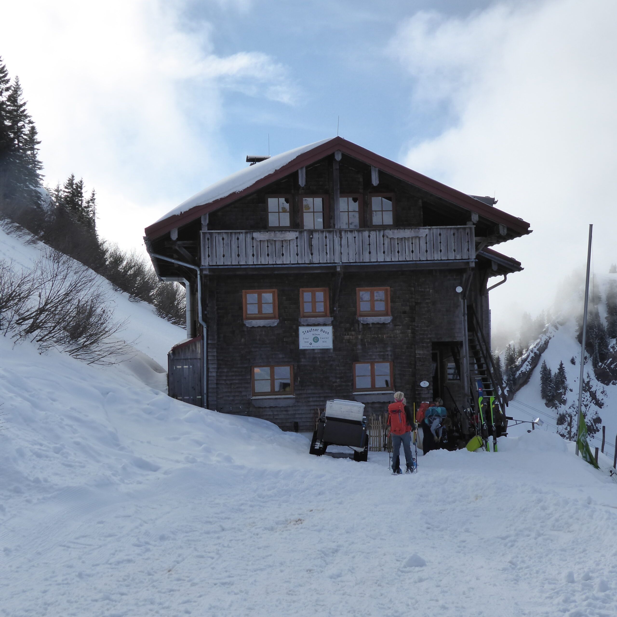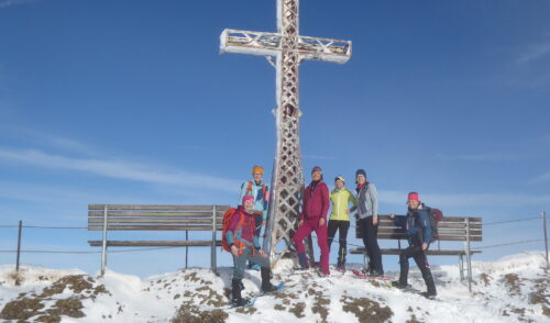 Am Sonntag ging es wieder auf den Gipfel des Hochgrat und von dort erst bergab und dann wieder bergauf zum Rindalphorn. Von dort ging es in einer breiten Rinne mit den Schneeschuhen angenehm bergab. Nach einer ausgiebigen Pause bestiegen sie noch den Gipfel des Gündleskopf. Auf beiden Gipfeln hatten sie eine traumhafte Aussicht auf ihre Route, aber auch auf die Allgäuer Alpen.